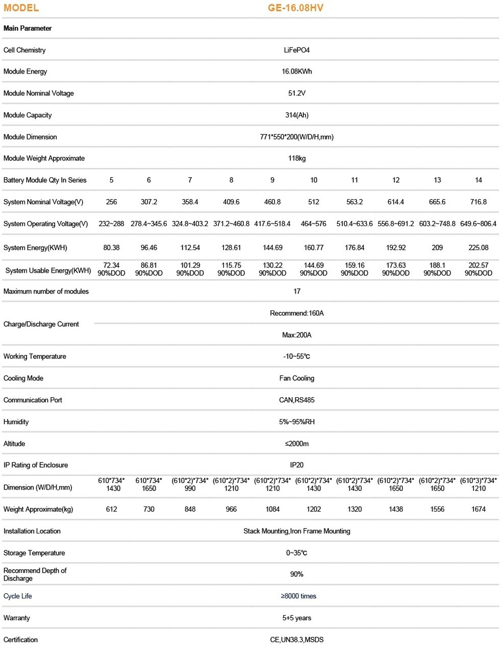 Scalable high-voltage 51.2V 314Ah LiFePO4 battery module, Compact structure, saving more space, flexible layout, easy to install, operate, and maintain. Two-level BMS intelligent management (BCU and BMU), with built-in protection cut-off switch; cooling fan and multi-hole heat dissipation structure for effective cooling; standard color display and WIFI module; supports multiple units in parallel.