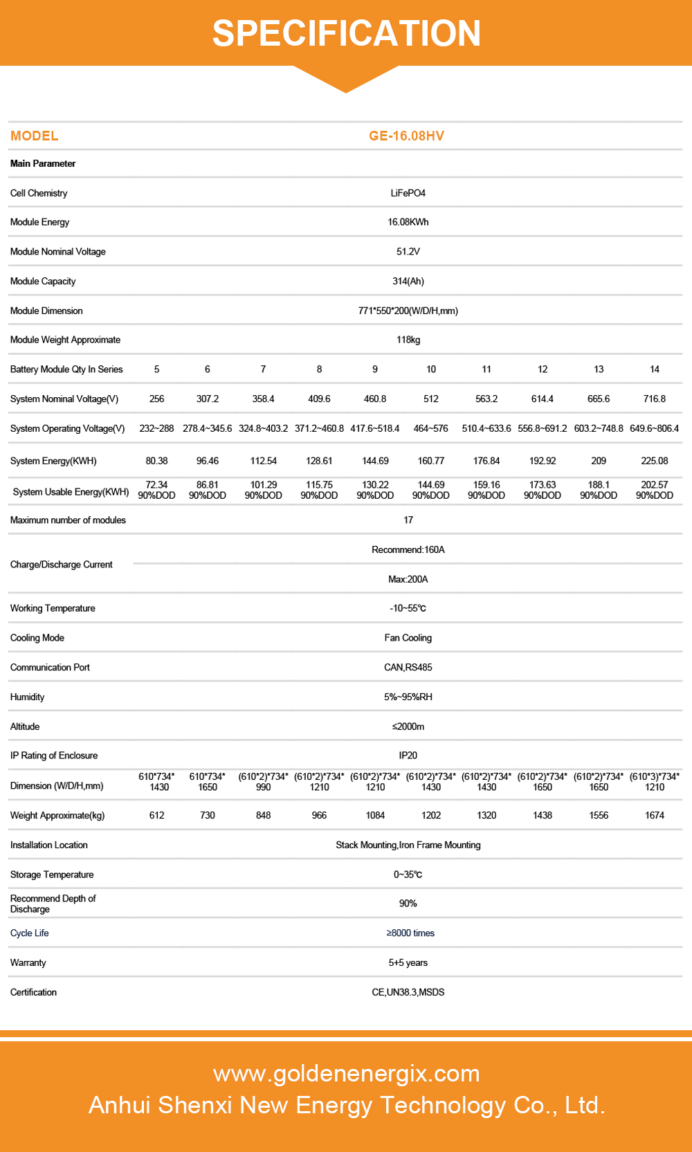 Scalable high-voltage 51.2V 314Ah lithium iron phosphate battery module,Compact structure, saving more space, flexible layout, easy to install, operate and maintain.Two-level BMS intelligent management (BCU and BMU), with built-in protection cut-off switch; cooling fan and multi-hole heat dissipation structure for effective cooling; standard color display and WIFI module; supports multiple units in parallel.